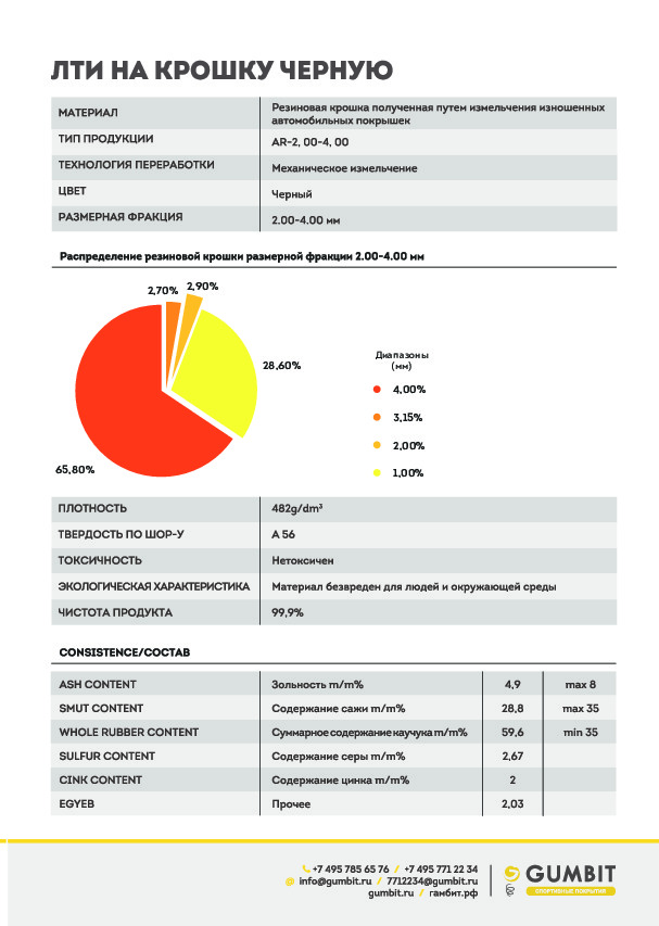 Резиновая крошка мелкой фракции предназначена для создания верхнего напыляемого слоя спортивных покрытий и для засыпки искусственного газона. Гранулят расфасован в биг беги. Масса резиновой крошки в одном мешке — 1000 кг.